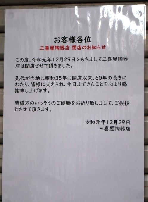 南口の末広通りの入り口そばにあった陶器屋さん、昨年末で閉店していたのですね。