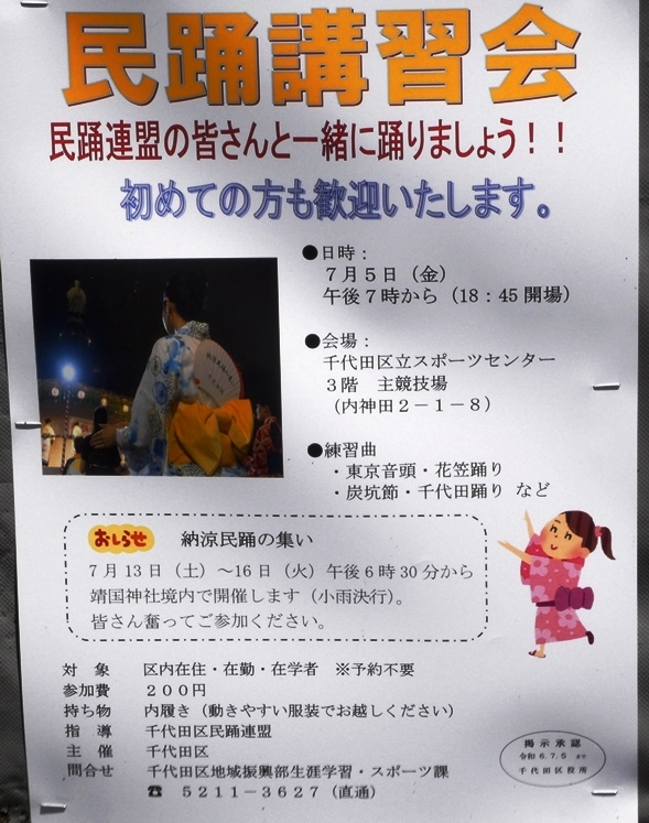 こっちは民謡踊りの案内。『民謡踊り』と言いながら、踊りの演目は『炭坑節』『東京音頭』などのようですから、『納涼盆踊り』みたいですね。