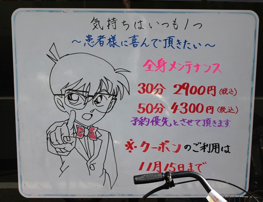 いつも楽しい本町整体院の案内掲示板、刃牙くんの時や、先日のハロウィンバージョンなどと比べると今月は少しおとなしいように思います。11月の後半にはまた新しいイラストになるでしょうから、期待しています。