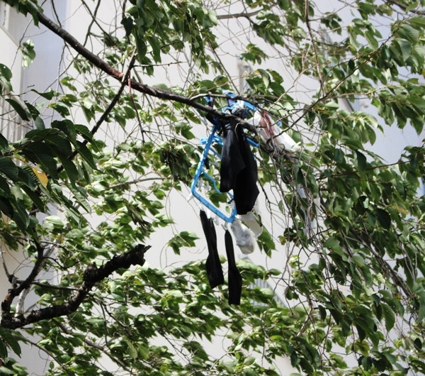 洗濯物が高い木にひっかかりぱなしです。