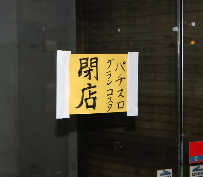 なんとも寂しいお別れの挨拶です。私はパチンコなどはしないので、直接の関係はありませんが、このビル、昔はO&A?とかいう名前の洋服屋さんのビルでした。僕が中学生の頃からあるビルですが、どんどんの空きフロアが増えています。