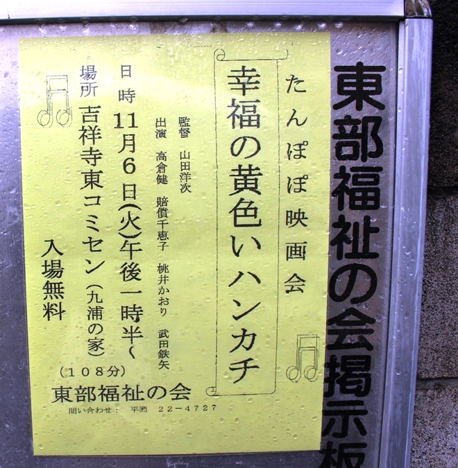 コミュニティセンターでの上映会です。『幸福の黄色いハンカチ』70年代の後半の映画ですね。 『幸福の黄色いハンカチ』、私はあんまり好きな映画ではないのですが、(山田洋次さんの作品全般が苦手なので・・)この時代から80年代の様々な映画(洋画、邦画問わず)には、まだまだ魅力を感じます。 大きなスクリーンで観たいという需要も多いのではないでしょうか? 名画座、本気でこの街で営業すればやっていけるように思うのですが・・・。 でもこのチラシ、誤植があります。『倍賞千恵子』さんです。『賠償』ではありません・・・ |