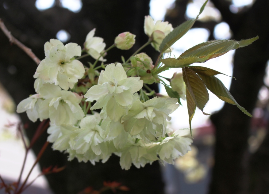 この桜、ヤマザクラの一種だと思いますが、青みがかった白い花を咲かせています。