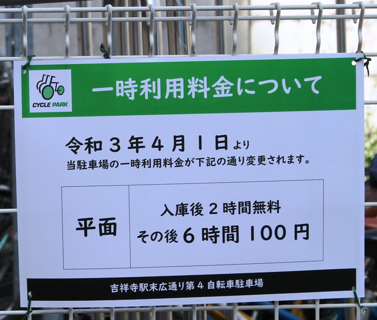 駐輪場。『最初の2時間無料』は堅持できたものの、その後は6時間100円だそうです。3/31までは12時間100円だったのだから倍に値上げです。