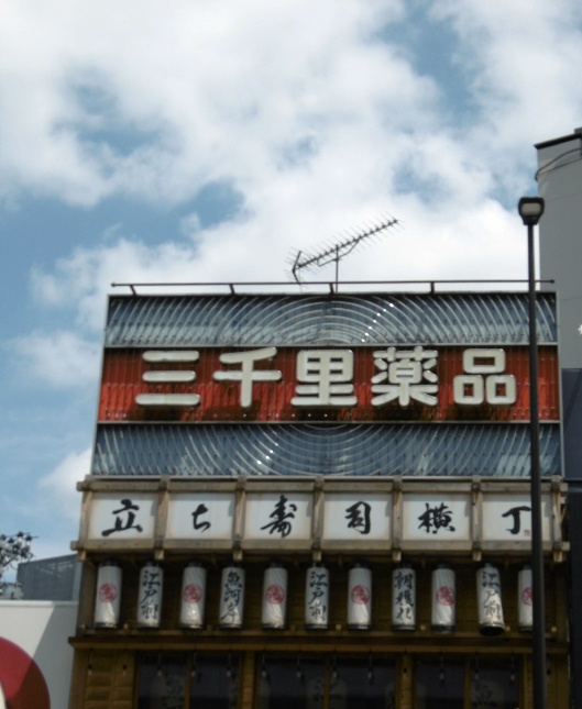 もう2年くらい経つのに、三千里薬品の看板が残っています。