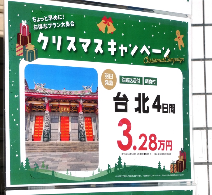 筋向いの旅行代理店でビックリ。これ交通費宿泊費込みなのかな?日本で旅するよりかなりお得。