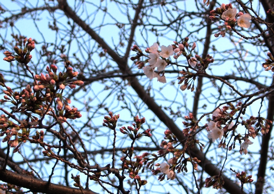 末広通りの真ん中にある花屋さんの前の桜です。もういつでも準備OK。あと一息、肩を押したら満開になりそうな気配です。
