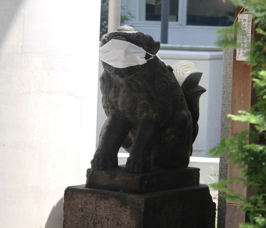 狛犬さんまでマスク姿。この神社ではコロナ対策として本堂の鈴の紐(綱)まで、使えないようにしてありました。