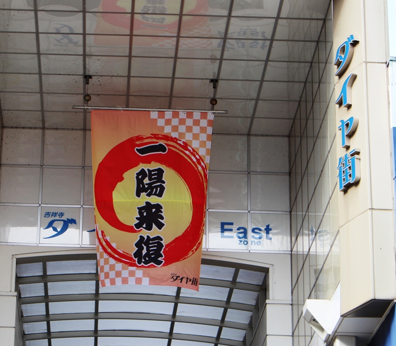 ダイヤ街の入り口のフラッグです。『謹賀新年』ではなく『一陽来復』。