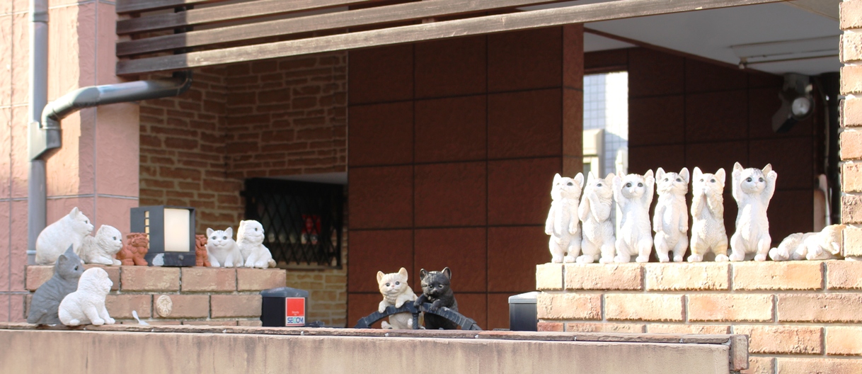 暑からず寒からずのいい季節。昼下がりの陽射しの中に猫さん達が勢ぞろいです。(シーサーさんもいるけれど)
