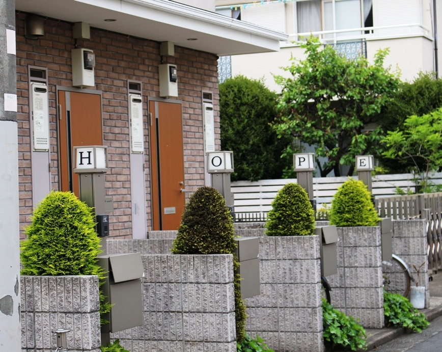 北町1丁目界隈のテラスハウスの玄関です。綺麗な『HOPE』の文字列。