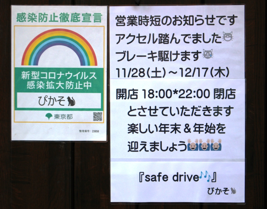 でも『ぴかそ』さん、感染防止徹底宣言の紙をみて分かったのですが、正式な店名は『ぴかそ』の後に猫さんのマークが入るんですね。何とも可愛らしいです。
