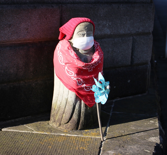 そしてこのお地蔵さん。防寒姿にマスクです。早くコロナの対策が出来上がるといいね。みんなでマスクを外して街で深呼吸をしたいねぇ・・・