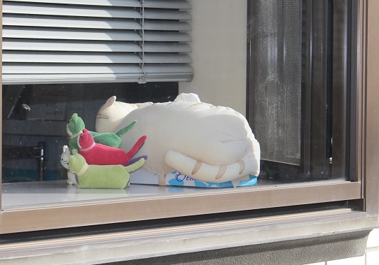 窓際に親子の猫。たま~に配置が変わって、窓の外を向いたり、親子で重なったりもしています。