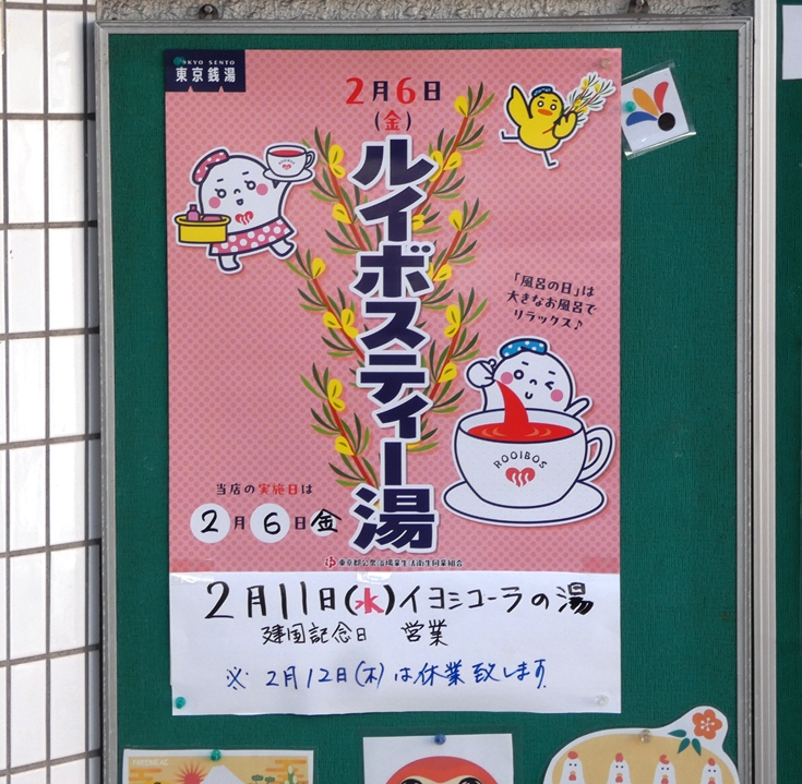 『ルイボスティー』の湯だよ。ビックリですね。でも下に小さな字で書いてある『イヨシコーラの湯』がもっと気になります。