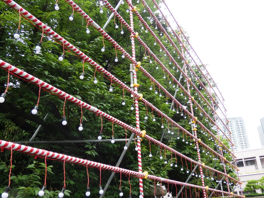 『みたままつり』の準備も進んでいました。これだけの電球が入って提灯が飾られるのだから、当日の夕刻は綺麗だろうね。