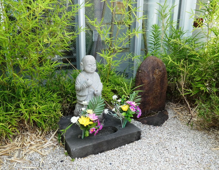 小さなお地蔵さん。釣り竿を持っています。『釣り地蔵』さん。さすがに暑そうです。
