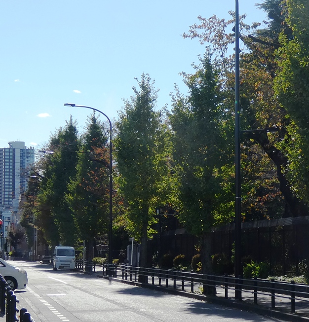 大野田小学校の前の通りにある銀杏並木。まだ青々としています。