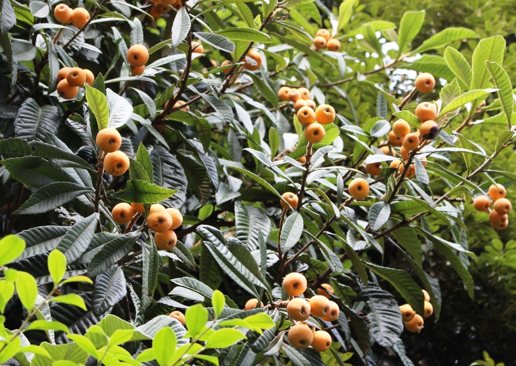 僕の好きな童謡『びわ』の歌詩のように、ロバさんの耳のような型の葉の下に、びわは抱っこしあってうれています。