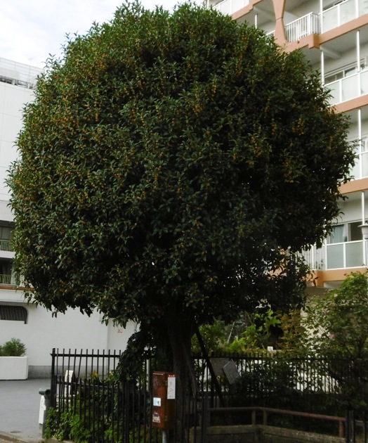 南町の旧いマンションの前庭にこんなに大きなキンモクセイが咲いていました。