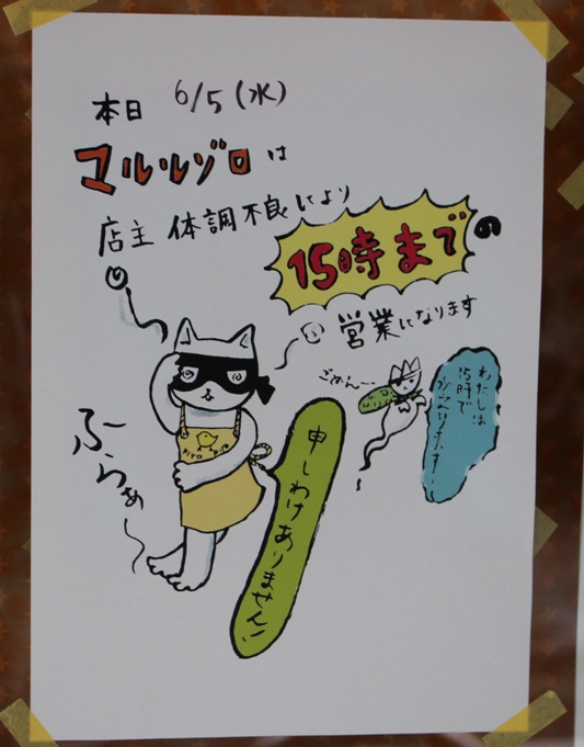 マルルゾロさん、木曜でもないのにお店が閉まっているのでびっくりしたら、こんな貼り紙がありました。
