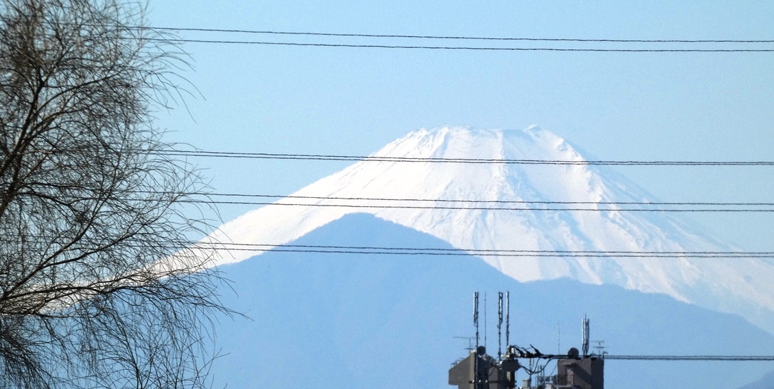 見事な雪景色の富士山遠景。綺麗だけど電線が邪魔ですね。