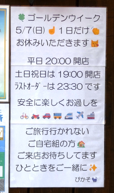 『ぴかそ』さん。休みは日曜だけです。
