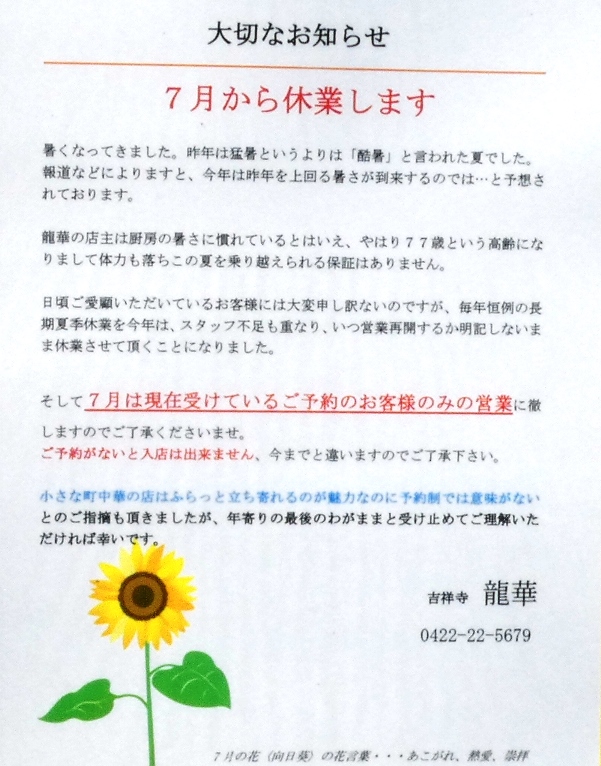 北町1丁目の町中華。『龍華』さん。暑さと年齢に勝てずに『休業』だそうです。