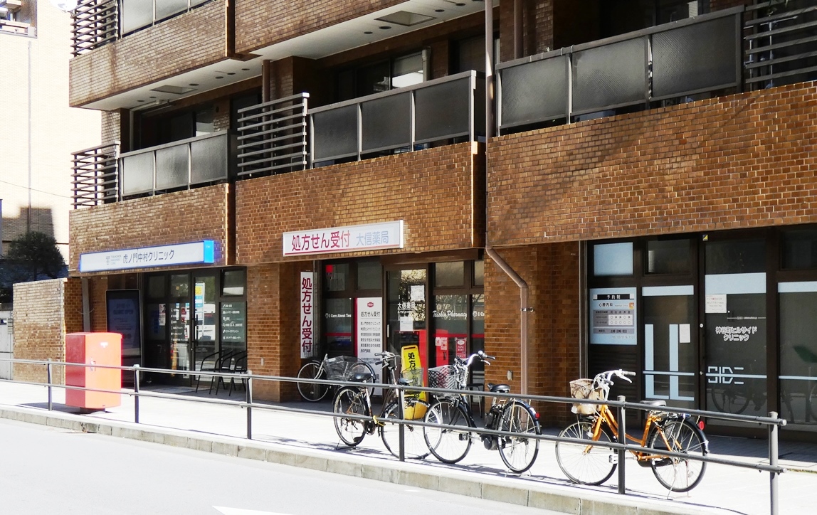 クリニックと薬局が並んで入っているテナントの前になぜか郵便ポスト。