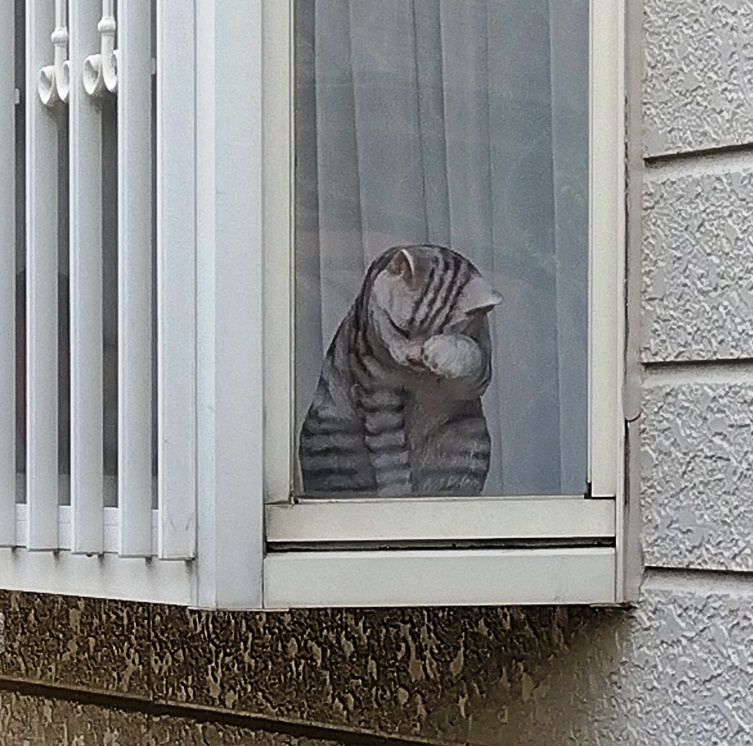 この出窓の猫さん。よくできているけれど置物です。ビックリしました。